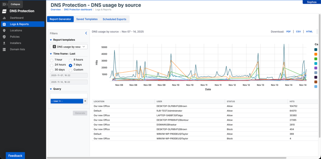 Όλα τα αιτήματα DNS που προέρχονται από τις τερματικές συσκευές σας καταγράφονται με τις ονομασίες χρήστη και συσκευής. Αυτό σας επιτρέπει να προσδιορίζετε προβληματικές συσκευές και να ετοιμάζετε στοχευμένες αποκρίσεις για να αντιμετωπίσετε ζητήματα ασφαλείας. Επιπλέον, εμπλουτίζει τα δεδομένα που είναι διαθέσιμα κατά τη διερεύνηση περιστατικών XDR και MDR.