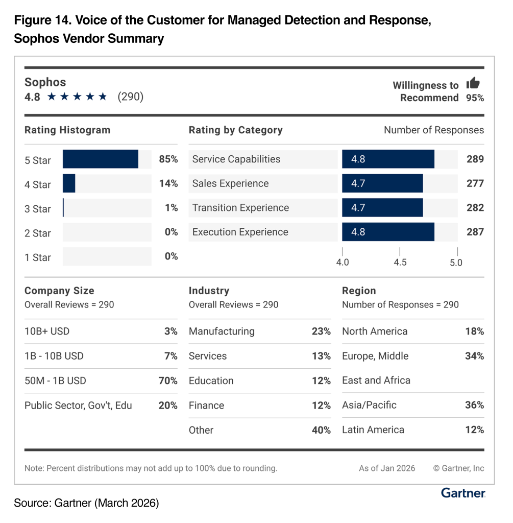 Στην έκθεση «Voice of the Customer» του 2026 για το MDR, η Sophos έλαβε συνολική βαθμολογία 4,8/5,0 βάσει 290 αξιολογήσεων και κριτικών, γεγονός που την καθιστά τον πάροχο με τις περισσότερες κριτικές/αξιολογήσεις στην έκθεση. Παράλληλα, η Sophos βαθμολογήθηκε με ποσοστό 95% όσον αφορά τη προθυμία των πελατών να τη συστήσουν σε άλλους. Σύμφωνα με τη Sophos, τα συγκεκριμένα αποτελέσματα αντικατοπτρίζουν την αποστολή της Sophos να παρέχει κορυφαία αποτελέσματα κυβερνοασφάλειας στους πελάτες της μέσω ισχυρών, ολοκληρωμένων λύσεων από άκρο σε άκρο.