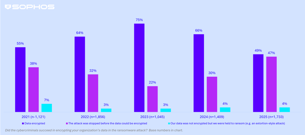 Data encryption in enterprise organizations is at its lowest reported rate in the five years of our survey, with under half (49%) of attacks resulting in data being encrypted down significantly from the 66% reported in 2024. In line with this trend, the percentage of attacks stopped before encryption has more than doubled over the past two years, climbing from 22% in 2023 to 47% in 2025. This suggests that enterprise organizations are becoming far more effective at detecting and stopping attacks before they cause serious damage.