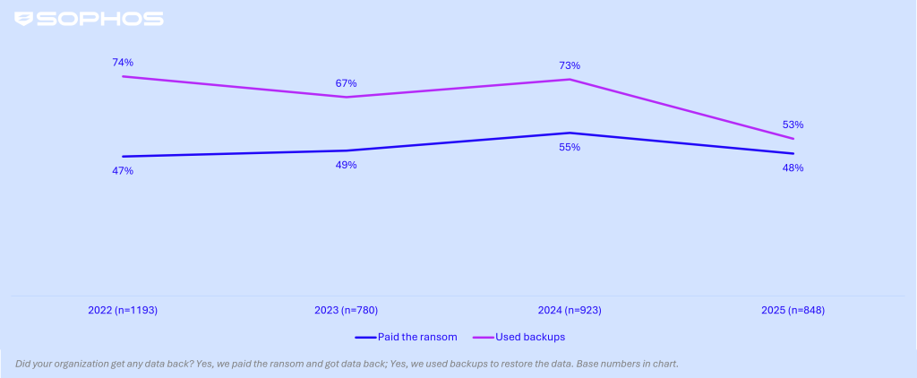 In 2025, close to half (48%) of enterprise organizations paid the ransom to recover data, broadly in line with levels seen over the past four years, indicating little overall change in payment behavior. Meanwhile, the use of backups dropped to a four-year low of 53%, down from 73% the previous year. Collectively, these findings point to stronger resistance to demands alongside underlying weaknesses and reduced confidence in backup recovery capabilities.
