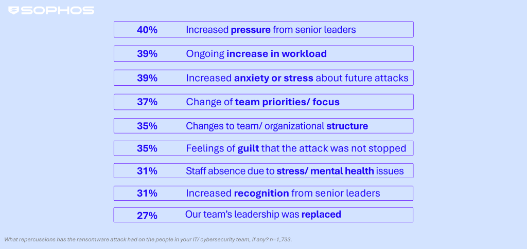 The survey makes clear that having data encrypted in a ransomware attack has significant repercussions for IT/cybersecurity teams, with increased pressure from senior leaders cited by 40% of enterprise respondents. Other repercussions include (but are not limited to):